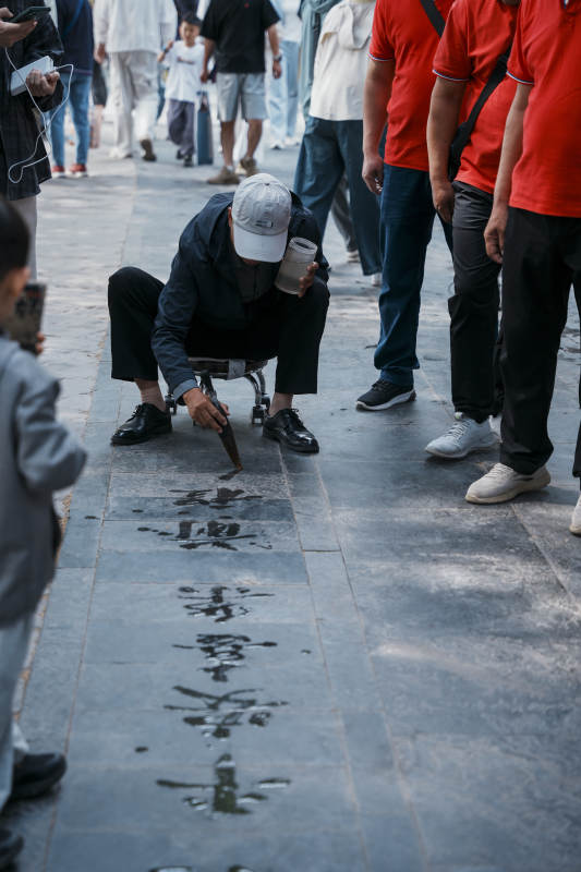 街头书法表演吸引众人观看