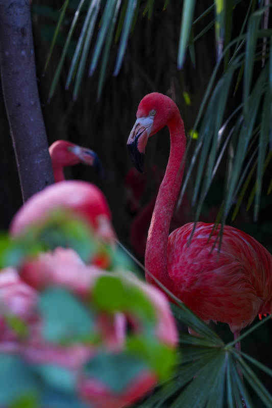 粉红火烈鸟在绿植间漫步