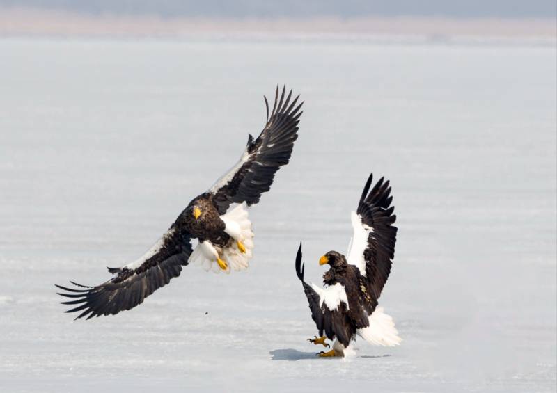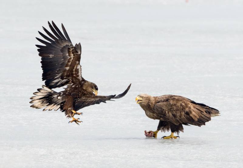 冰上争食的两只鹰