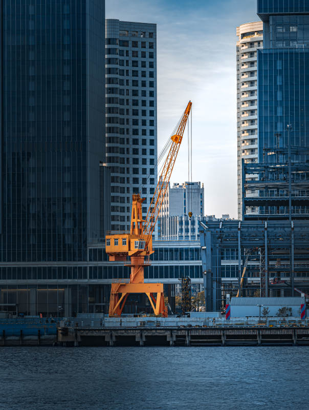 城市河畔的黄色起重机