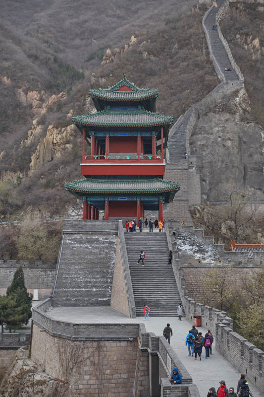 长城上的古塔与游客
