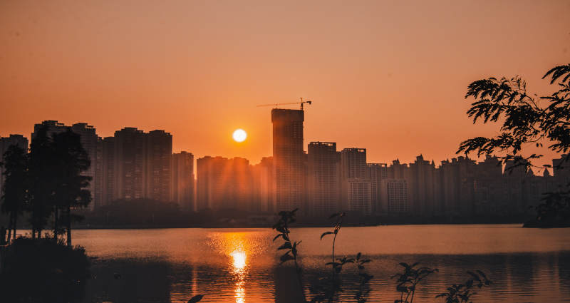 城市黄昏 湖光倒影