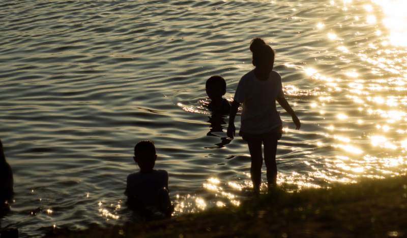 夕阳下的水边嬉戏