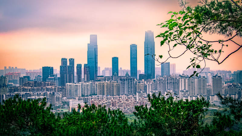 城市天际线与绿树相映