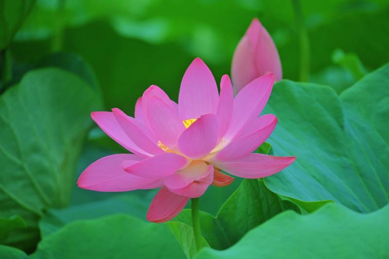 粉色莲花绽放于绿叶间