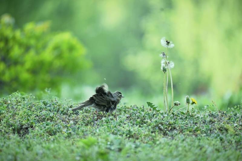 草地上的小鸟与蒲公英