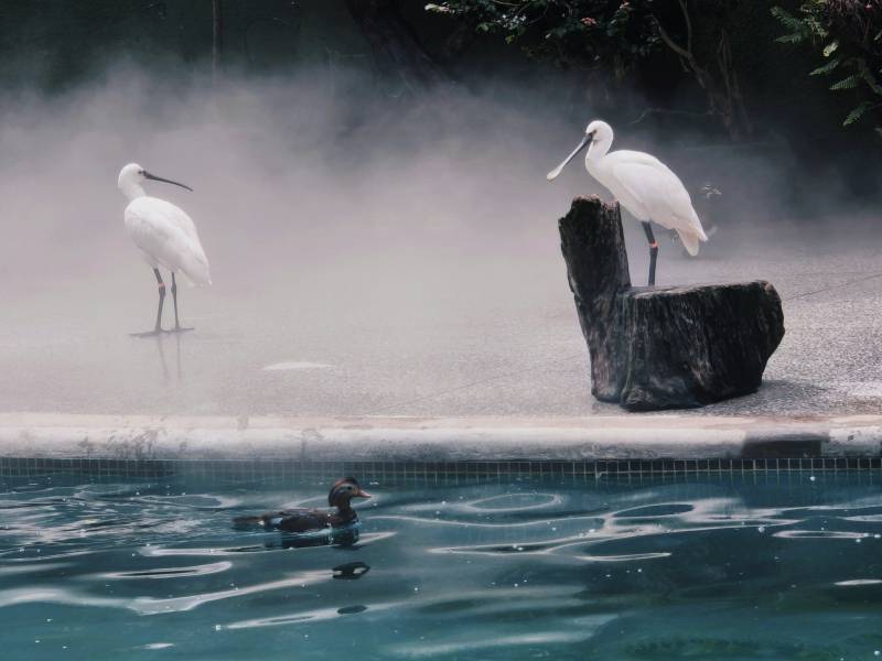 池畔白鹭与鸭共舞