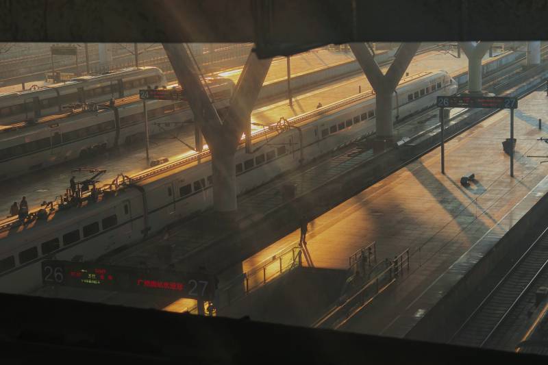 车站夕阳下的列车静候