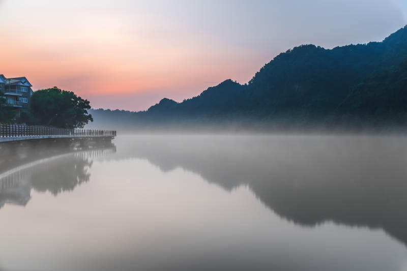 晨雾湖畔 静谧如画