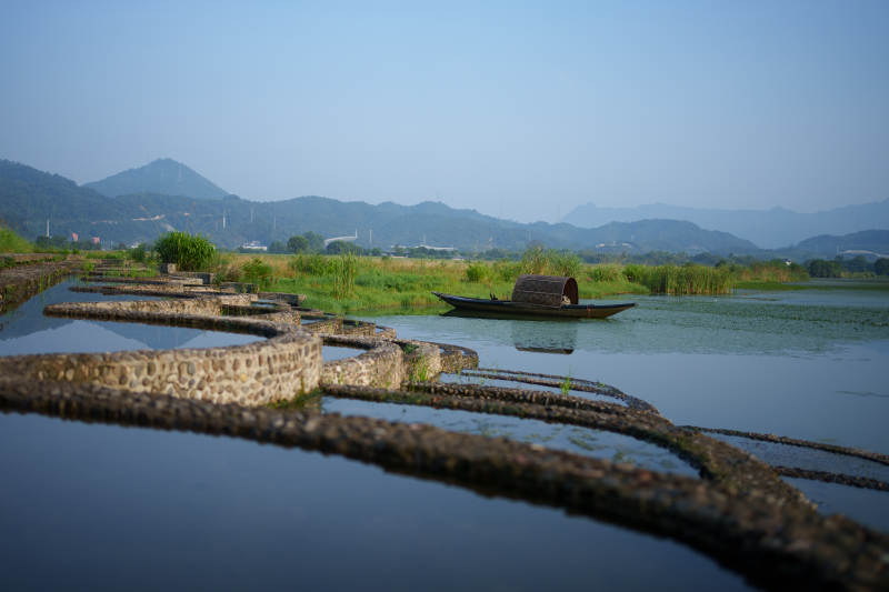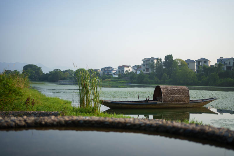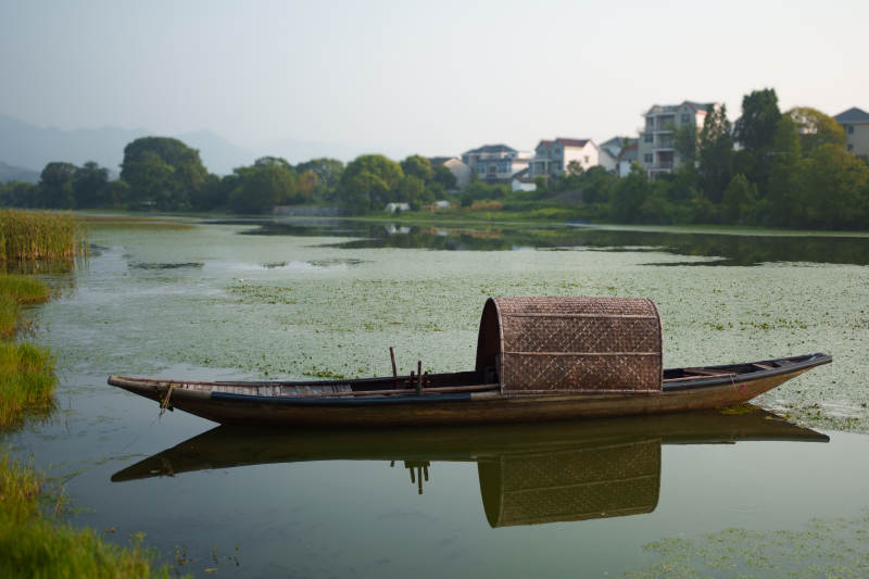 湖畔竹篷小舟静谧景--新安江