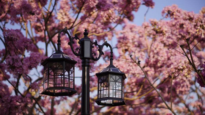 樱花树下的复古路灯