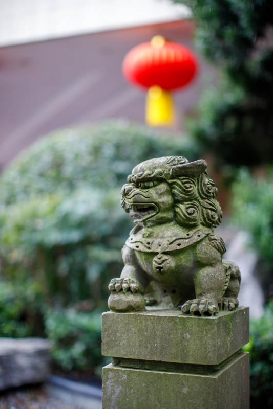 石狮与红灯笼的静谧场景