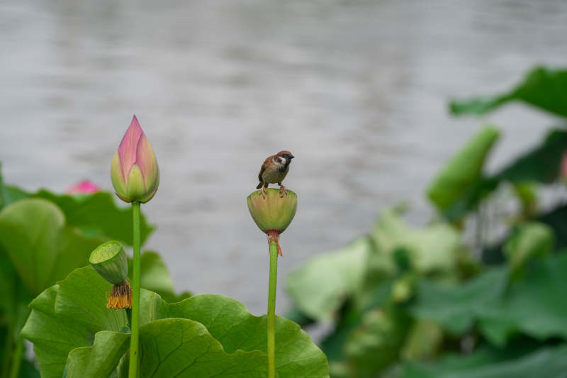 小鸟栖息莲花旁