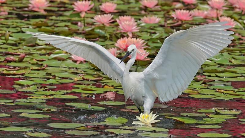 白鹭展翅 莲池觅食