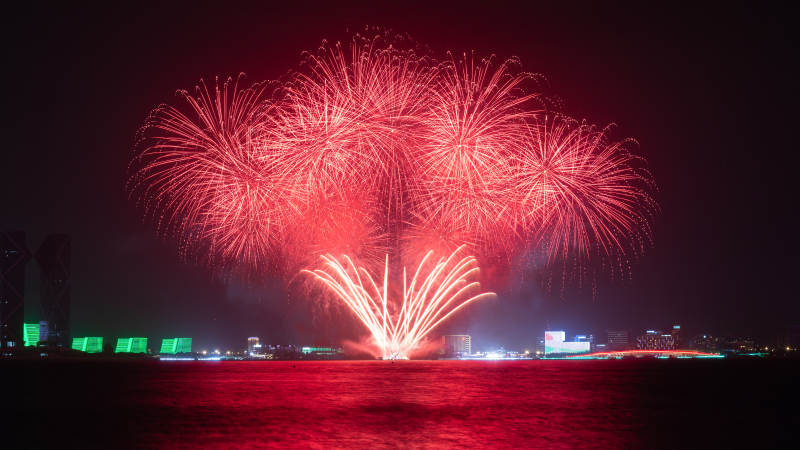 夜空烟花绽放 城市倒影辉煌
