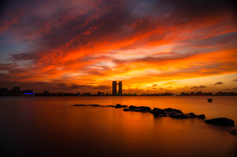 夕阳映水 城市剪影