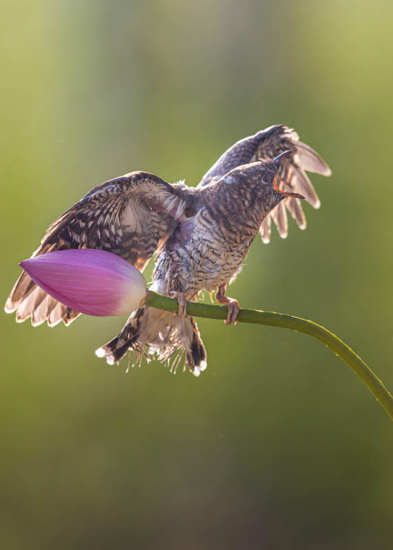 鸟儿栖息莲花上展翅