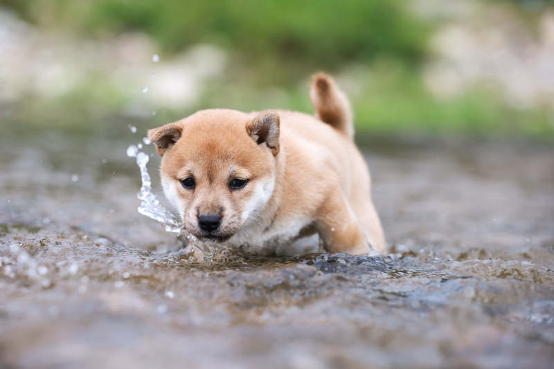 柴犬幼崽溪中漫步
