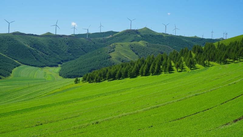 乌兰布统绿色田野与风车群景