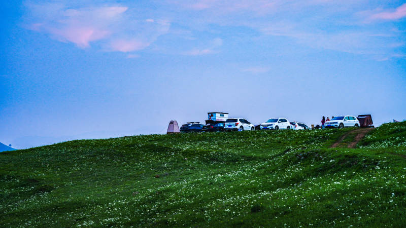 草原上的车影与蓝天