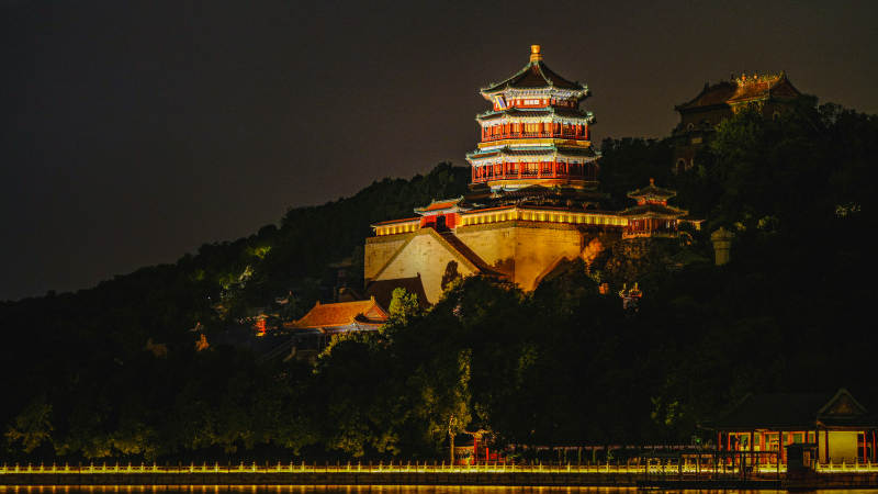 香山万寿琉璃塔与彩绘殿堂相映成辉