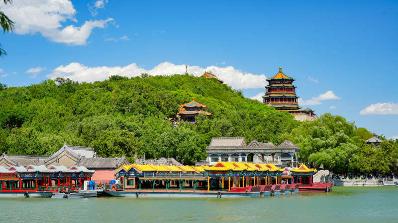 颐和园湖畔游船与古塔