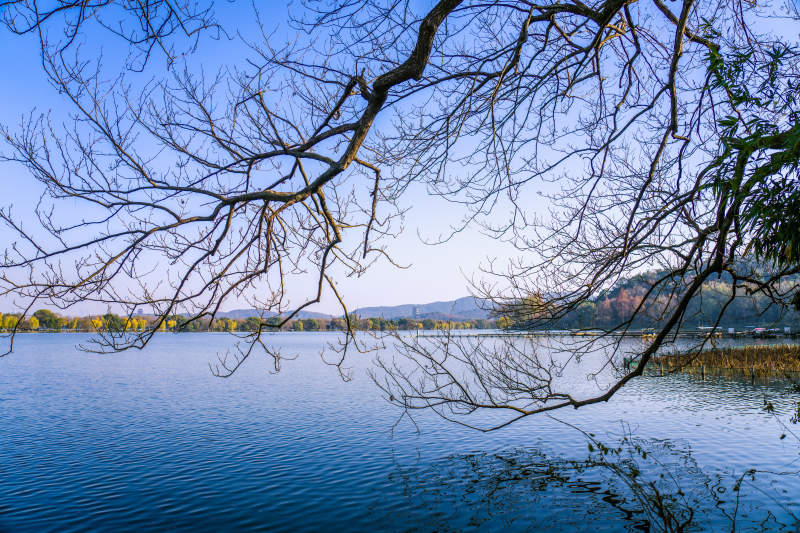 湖畔枝影映蓝天