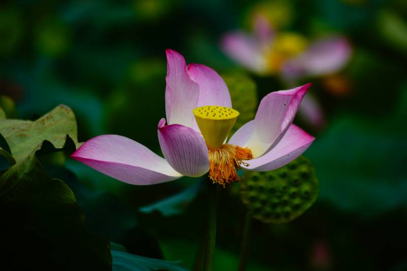粉色莲花绽放于绿叶间