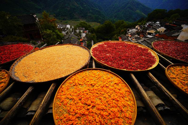 晒秋丰收图位于婺源篁岭