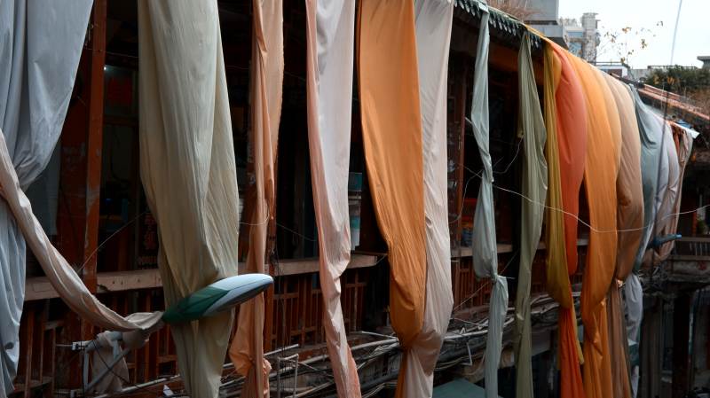 泉州侨乡商品街彩布随风飘扬