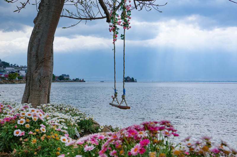 大理洱海边花丛中的秋千