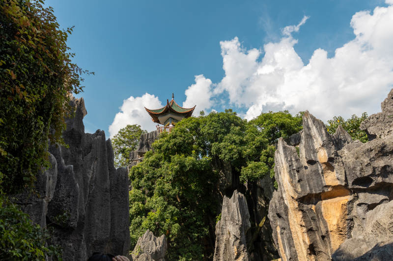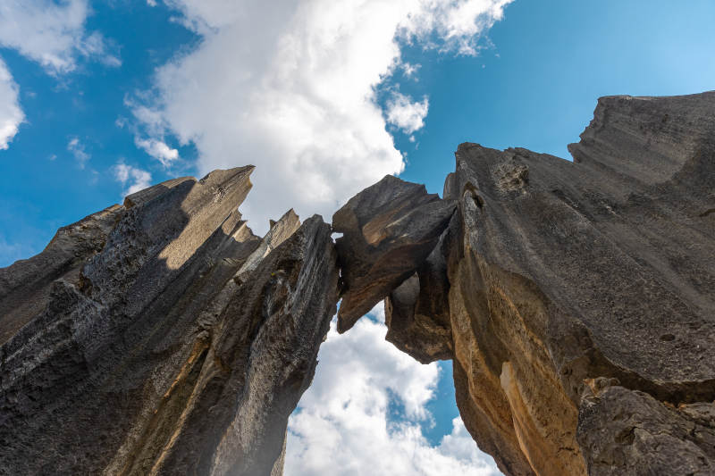昆明石林蓝天白云间的奇岩怪石