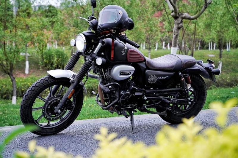 黑色摩托车静停绿意中