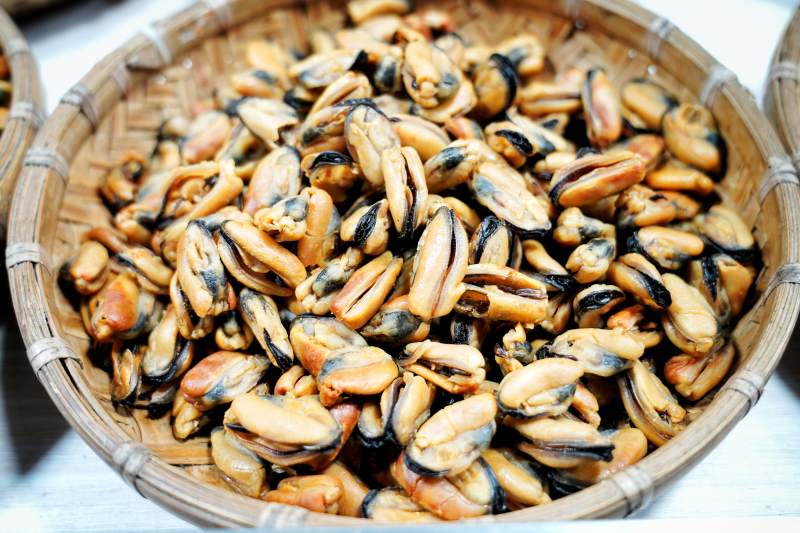 新鲜贻贝盛满竹篮