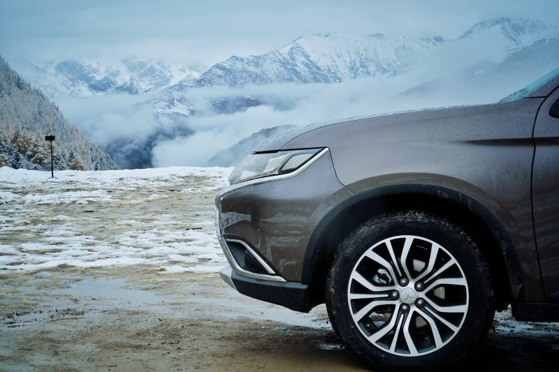 雪山旁的灰色SUV