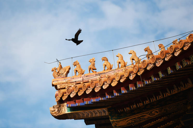 飞鸟掠过古檐脊兽