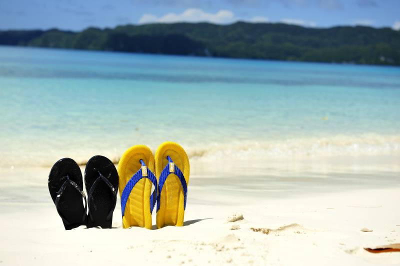 帕劳 海边沙滩上的两双拖鞋