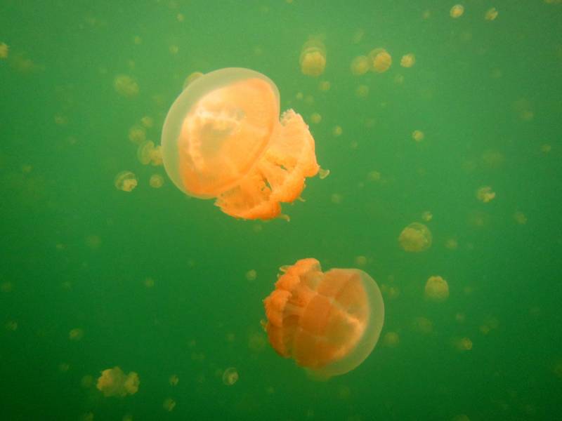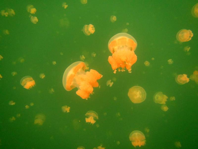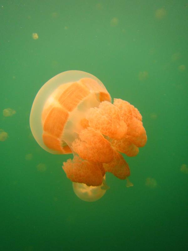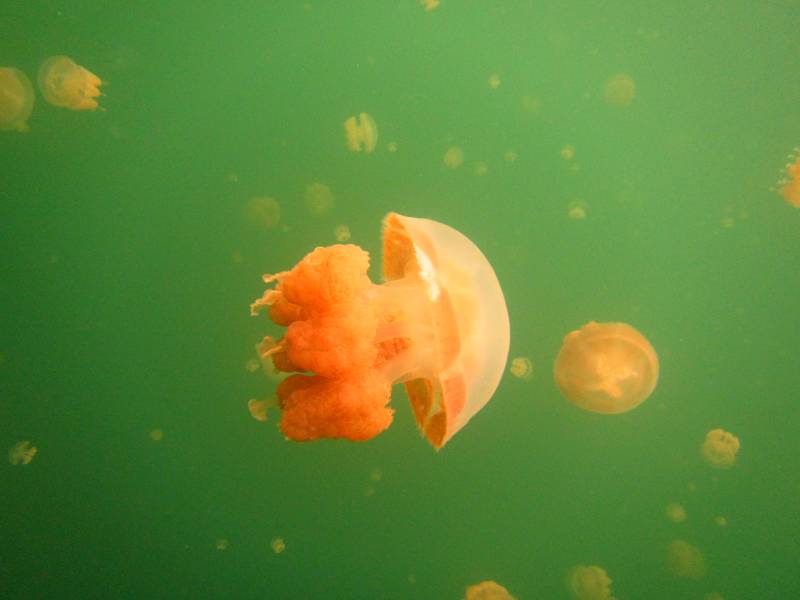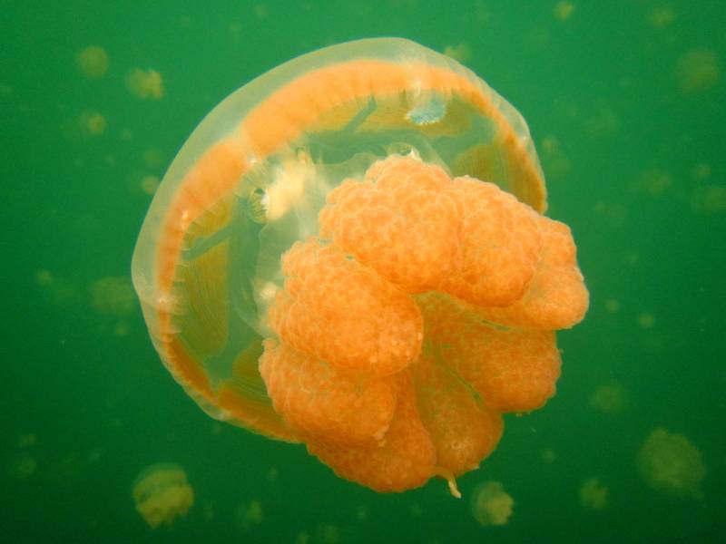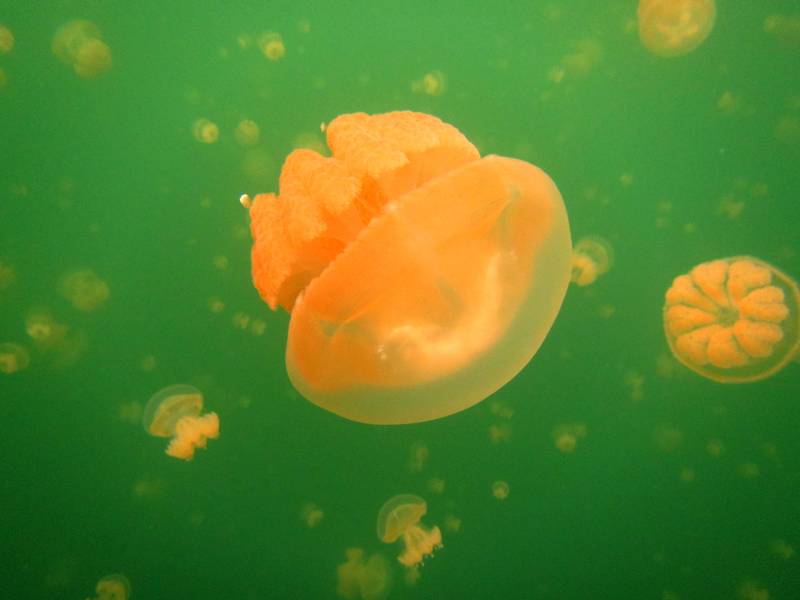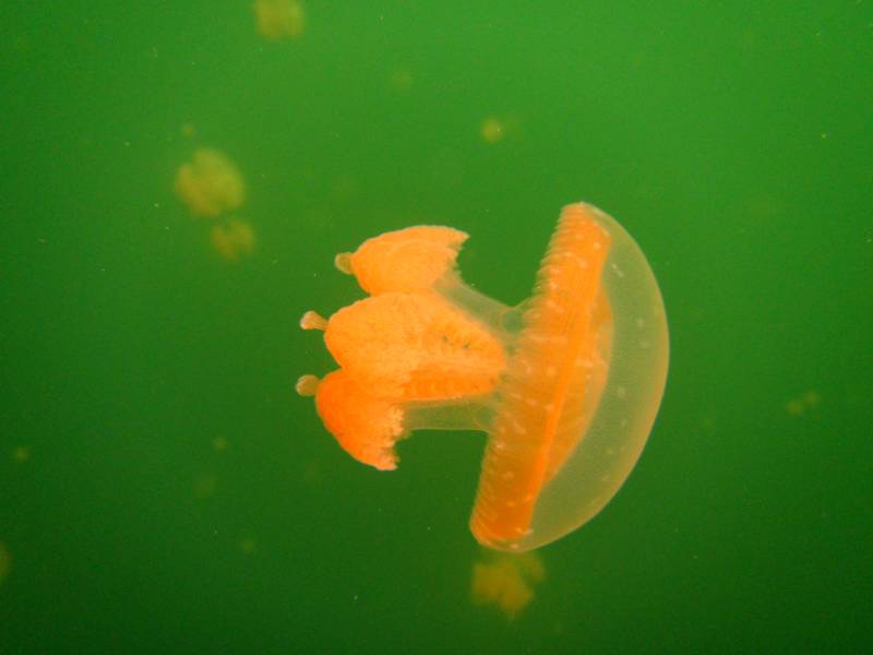 橙色水母在绿水中漂浮
