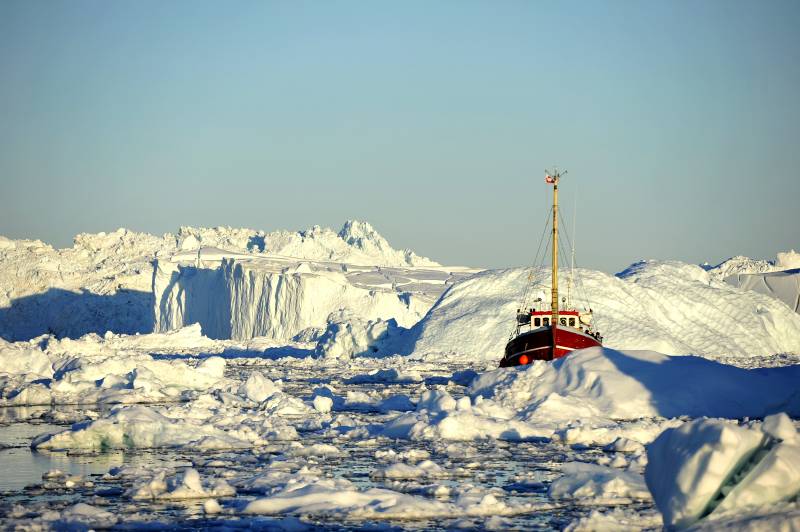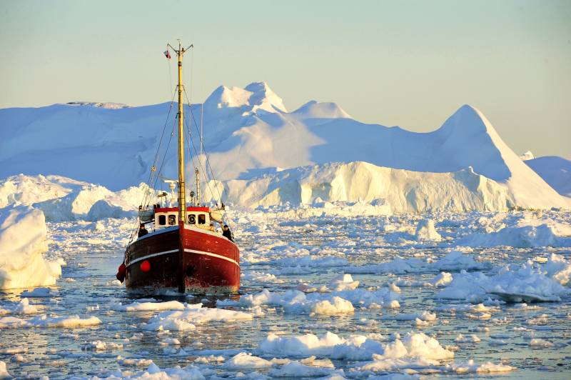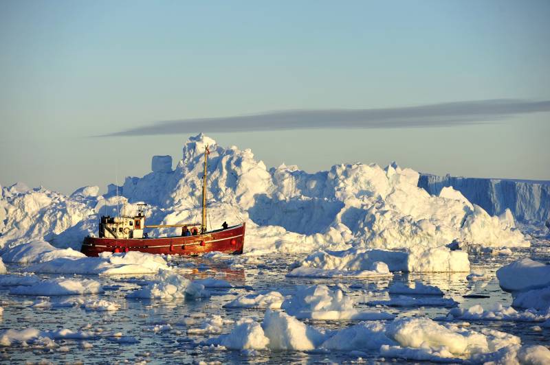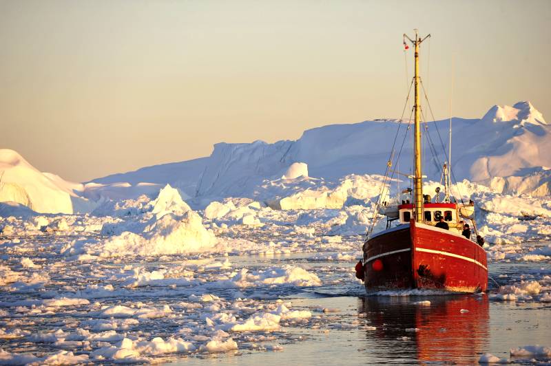 格陵兰岛 午夜巡航极昼 冰川中的红色船只
