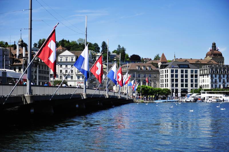 瑞士湖畔的旗帜与建筑