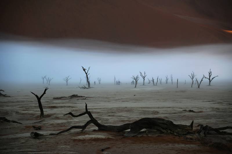 纳米比亚沙漠中的枯树与雾气