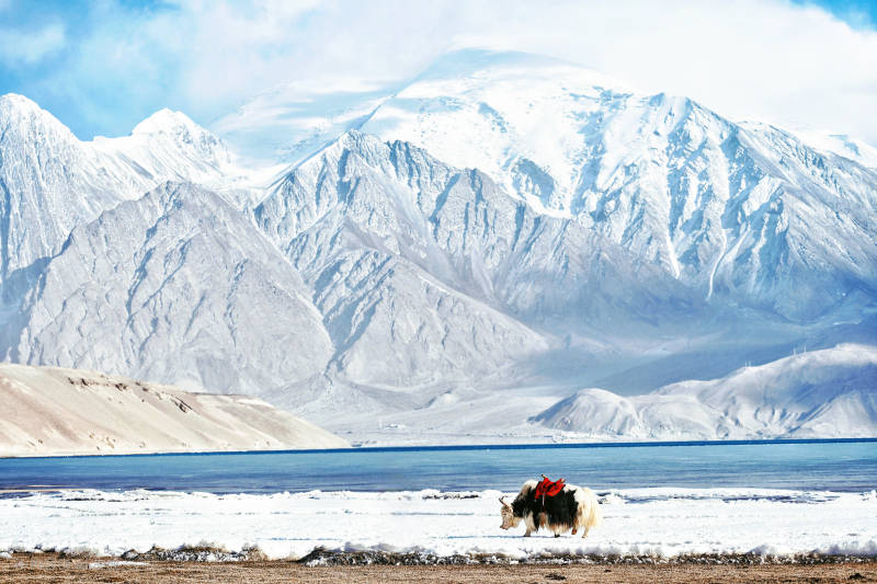新疆白沙湖雪山下的牦牛