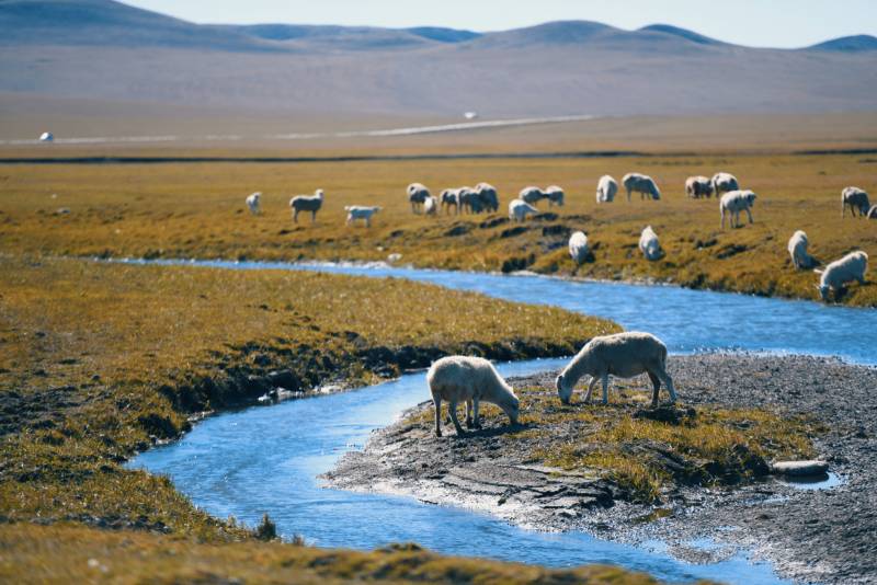 内蒙草原溪边羊群悠闲