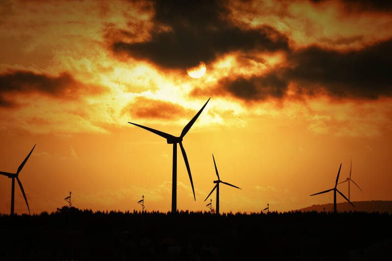 福建平潭岛夕阳下的风车剪影