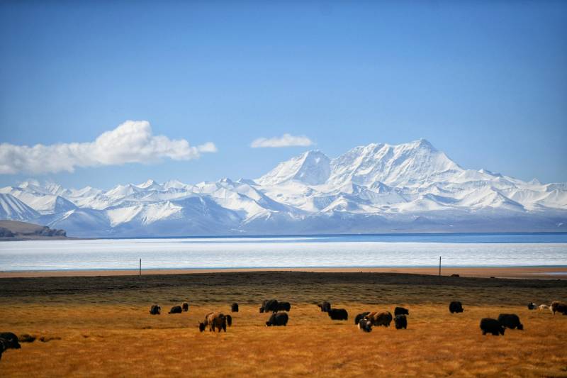 西藏雪山湖畔牦牛群