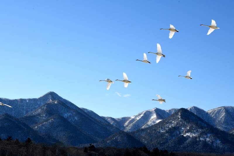 日本北海道天鹅飞翔 雪山映衬