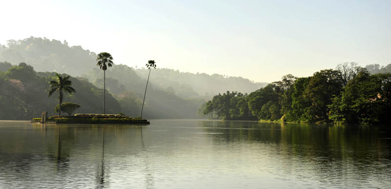 斯里兰卡湖光山色晨雾中
