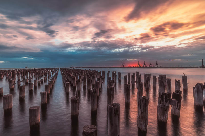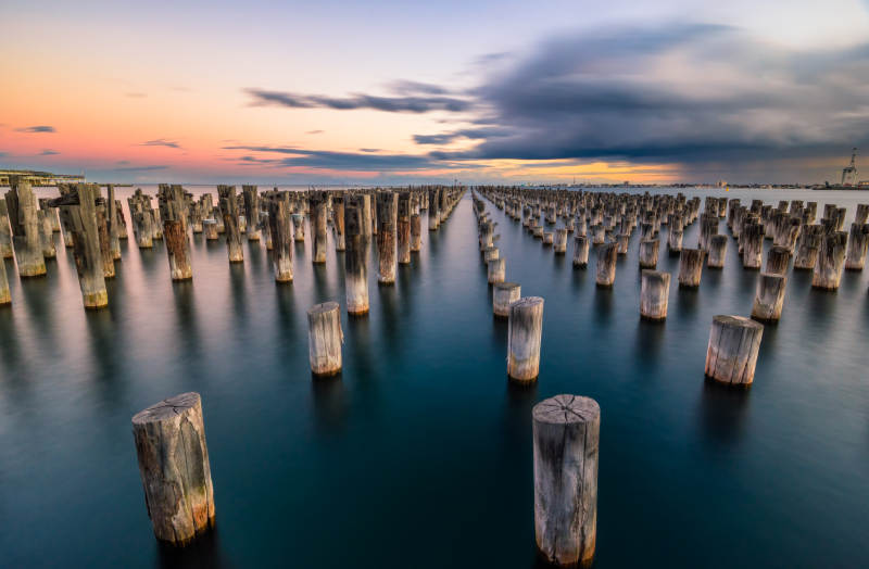 暮色中的墨尔本王子港木桩