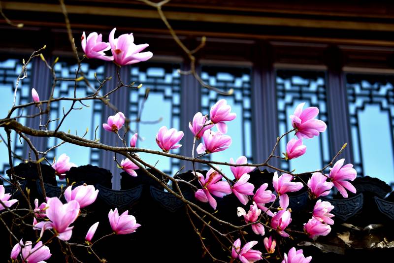 玉兰绽放古建筑前