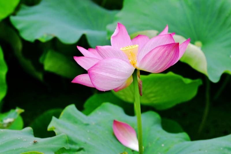 粉莲绽放绿叶间
